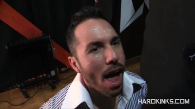 Mikel Bosco et Tyler Roding soumette ce minet pendant l'afterparty. Il lui crache à la gueule et lui fait lécher ses pieds avant de l'attaché à un poteau