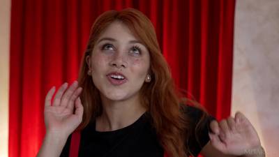 La rousse Marina Gold se déshabille et écarte les jambes pour toucher les lèvres de sa chatte rose rasée !