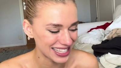 Une jeune blonde filmée en gros plan alors qu'elle suce l'épaisse bite de son amant au fond de sa gorge jusqu'à ce que la bite gicle sur son visage.