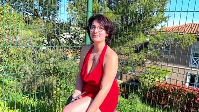 La française à lunettes Mizaki a mis sa robe rouge, pour paraître plu sexy. La scène commence en lesbien avec une blonde et passe en trio.