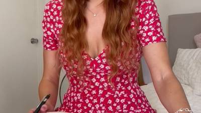 Une jeune fille aux cheveux roux et aux lunettes, suce la bite de son amant et le chevauche, en style cowgirl inversé, dans sa vidéo maison.
