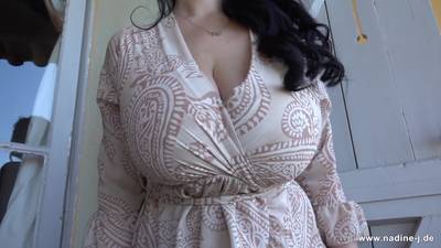 Luna Amor dans un décor champêtre sur le balcon, tente et excite tout le monde en montrant ses gros seins naturels, en pinçant ses mamelons et en les caressant.