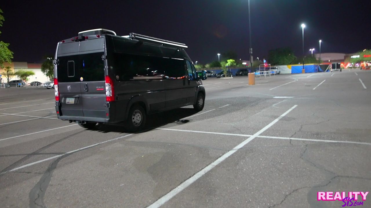 Brune, chatte touffue trempée, pompe la queue raide dans la van. Elle se fait prendre en diverses position, jets épais sur son visage et petits seins.
