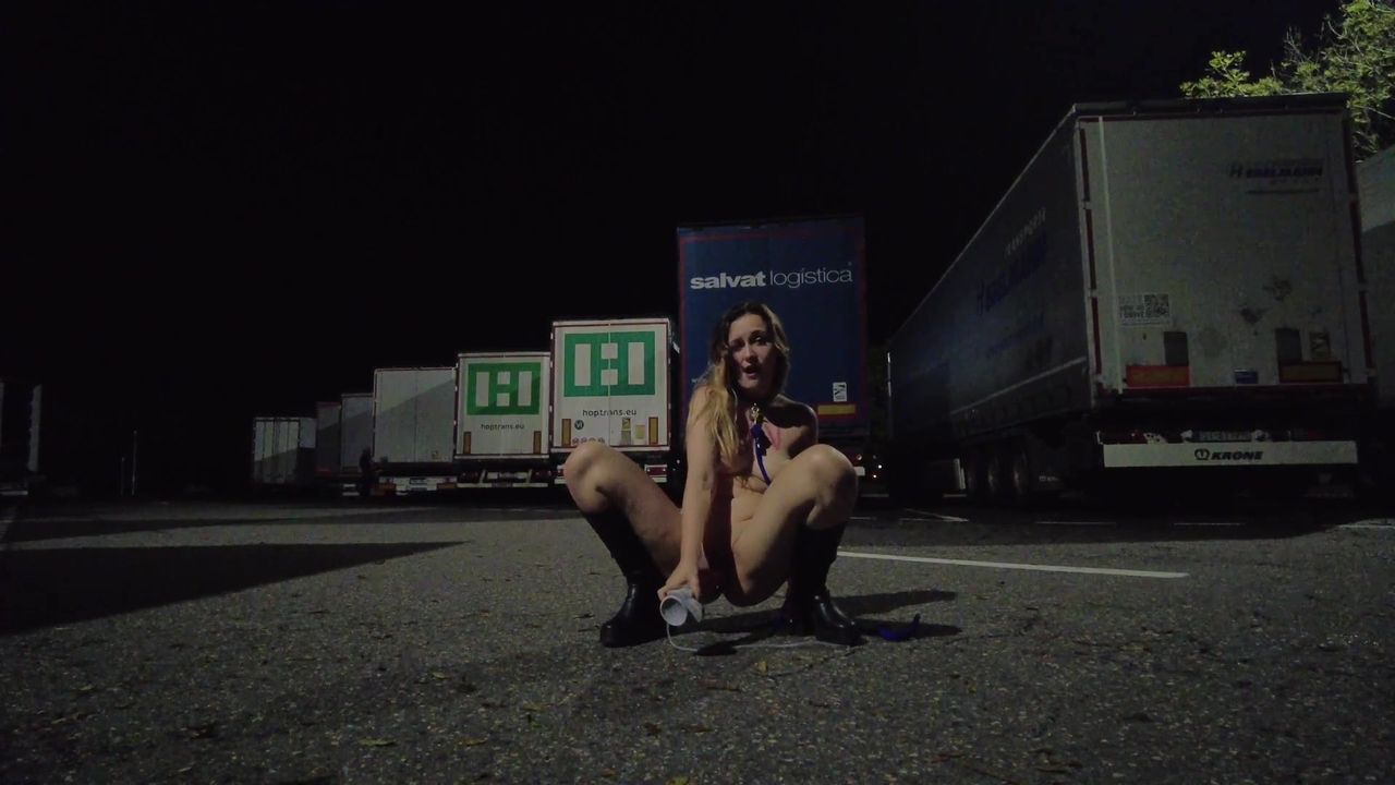 La petite salope française veut que tout le monde la voie se masturber sur le parking pour camions. Elle écarte les jambes et utilise son gode pour se pénétrer.