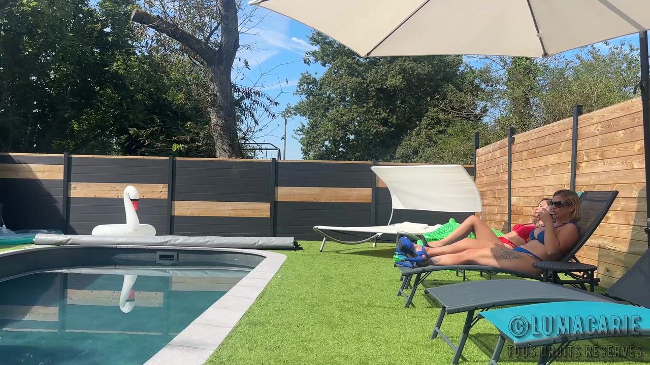 La journée ensoleillée se prête pour que ce couple de lesbiennes françaises se masturbent en utilisant des dildos au pied de la piscine dans le jardin.
