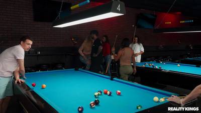Shrooms Q montre ses seins et sa culotte à Johnny Love au billard, se fait dévorer en cachette, puis se penche sur la table de billard pour se faire baiser.