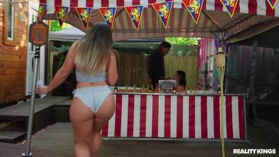 Une femme sexy se déguise en médiévale, elle suce, baise debout et finit sur la table en missionnaire dehors en public devant tout monde.