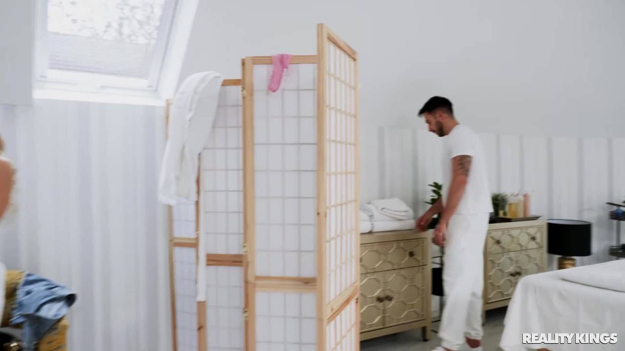 Maya Rose se déshabille pour le masseur Francis X et se fait masser les seins et la chatte avec de l'huile. Elle suce sa bite et se fait doigter la chatte.