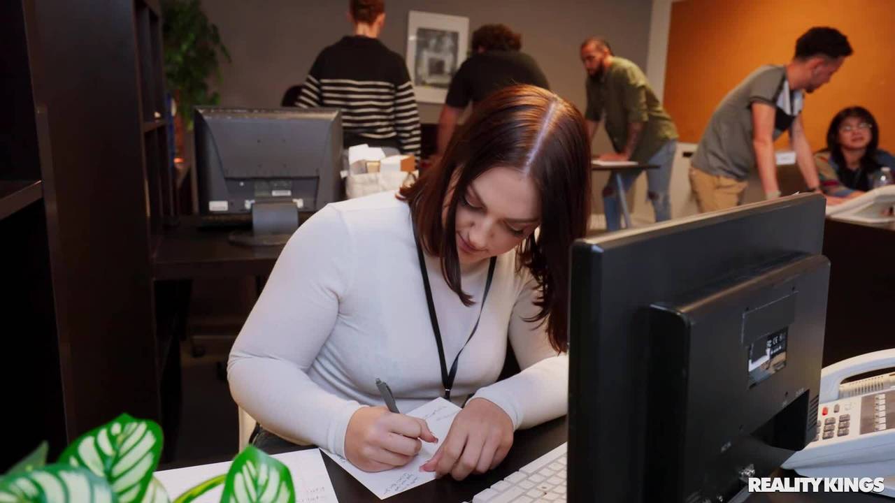Les collègues partent en pause déjeuner et Lucy Lotus commence à branler James Angel sous la table, puis le suce après que leurs collègues soient partis.