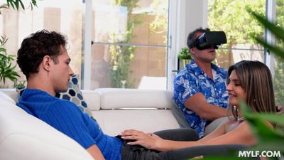Ce mari cocu joue à des jeux VR, alors sa femme se met à poil et commence à sucer son voisin avant de se pencher et de se faire baiser en levrette.