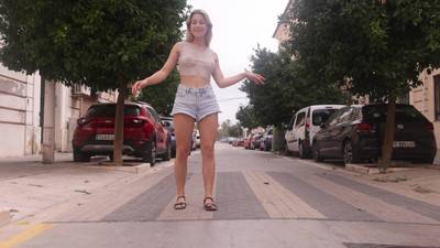 Cassandra sort ses seins sous les regards curieux, sa démarche provocante attise les désirs, transformant la ville en un spectacle érotique.