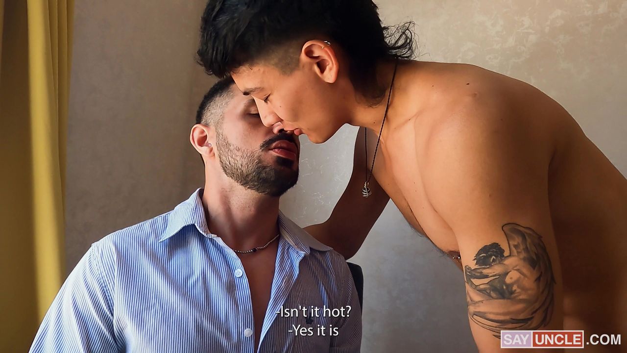 Un twink latino suit des leçons d'espagnol mais comme il fait trop chaud, il enlève ses vêtements. Le prof s'excite en le voyant nu et enlève donc ses vêtements.