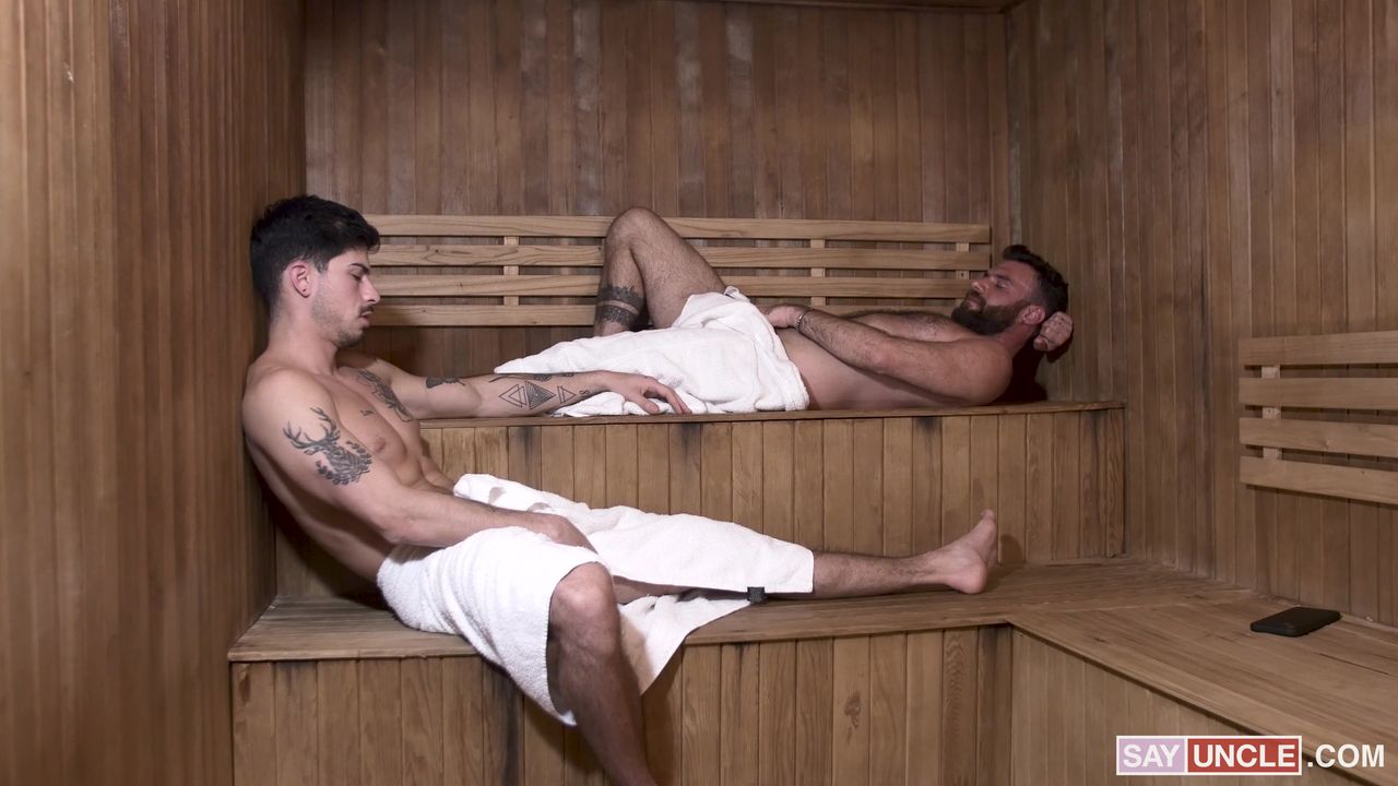 Dans le sauna, ces hommes font un peu de conversation légère mais rapidement leur discussion les amène à se sucer mutuellement la bite
