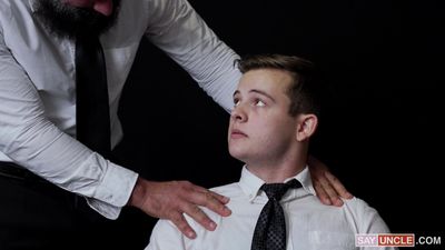 Ce twink poilu va se faire dominer par ce DILF ! Il enlève ses vêtements puis se met à lécher et sucer son trou du cul serré