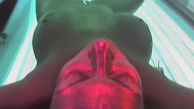 Une femme brune elle va se faire filmer sans le savoir dans son salon ! Elle a rendez-vous pour peaufiner son bronzage et on peut dire que c'est sympa