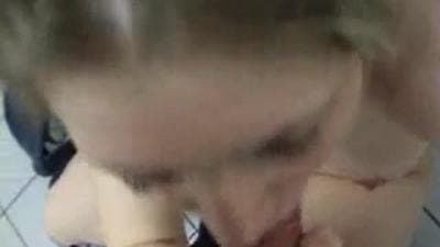 Dans des toilettes publics cette petite cochonne aux gros seins pompe bien le pénis de cet homme qui adore les coups de langue qu'elle lui offre !