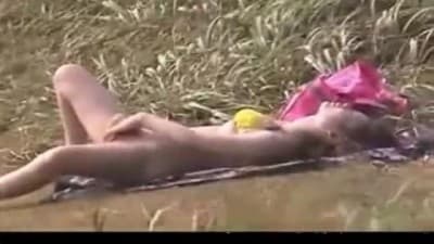 Cette jeune asiatique se retrouve seule à la plage et elle en profite pour se masturber