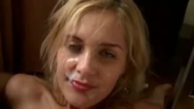 Très jolie blonde en chaleur, qui suce comme il se doit la queue de son homme, qui ne tardera pas à lui finir sur la gueule ! Le tout en streaming