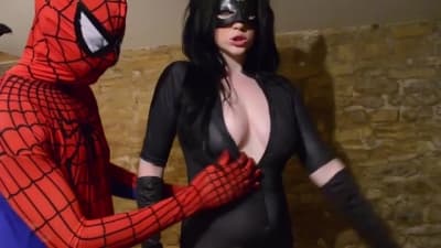 Harmony Reigns est vêtue de son costume de femme-chat alors qu'elle suce la bite de son amant spiderman avec une bite dure.