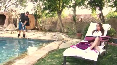 Kacy Lane chauffe le jardinier au bord de la piscine. C'est bon et c'est chaud comme elle le cherche.
