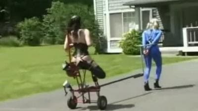 Une salope de maitresse est assise sur une machine qui la gode lorsque sa soumise ture cette machine comme un cheval