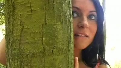 Cette petite jeunette brune va chauffer le vieux qu'elle croise dans les bois pour ensuite se faire baiser comme une chienne contre un arbre.