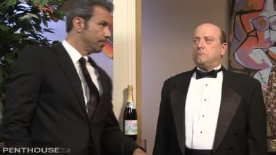 Une milf blonde à gros seins se tape cet étalon dans son salon. Lui taille une pipe se fait enculer