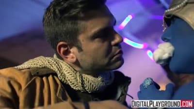 Cette salope toute en bleue baise avec deux mercenaires pour tenter de s'échapper. Elle suce et se fait bourlinguer par les deux voyous