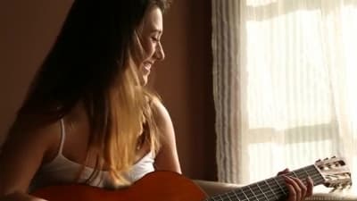 Dans cette vidéo, Eva Lovia travaille son doigté sur une guitare avant de se masturber sa petite chatte.