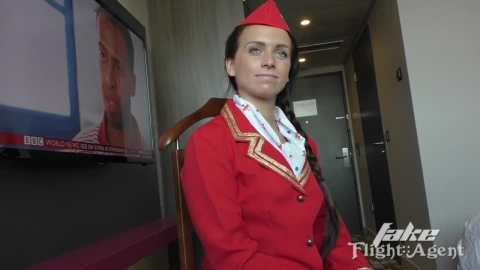 Une fausse hotesse de lair se fait baiser la chatte par un faux pilote il lui pose des questions son age et après il l'a baise